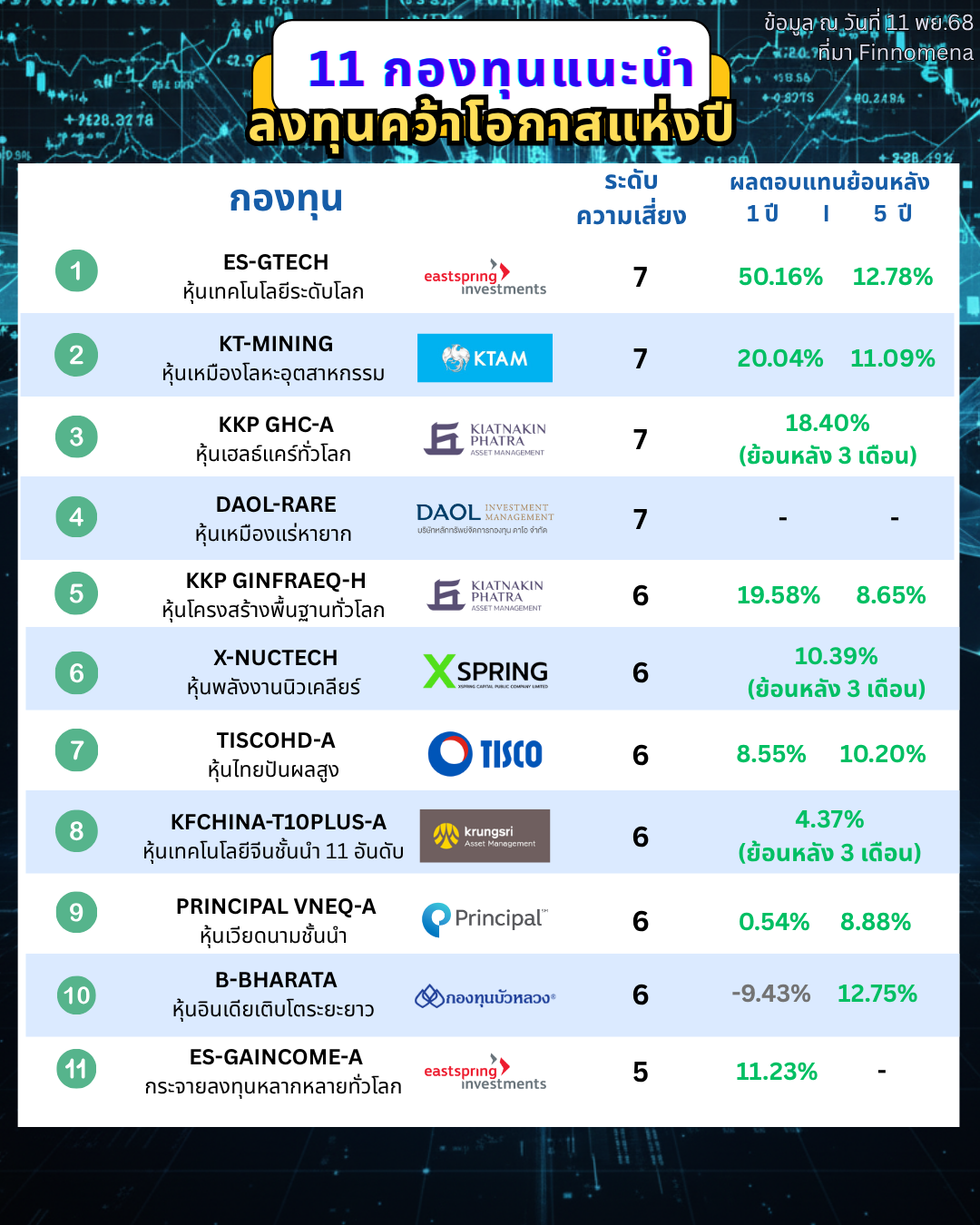FINNOMENA Funds. มัดรวม 11 กองทุนแนะนำ ลงทุนคว้าโอกาสแห่งปี 2025 (เผยแพร่ 11 พฤศจิกายน 2568)
