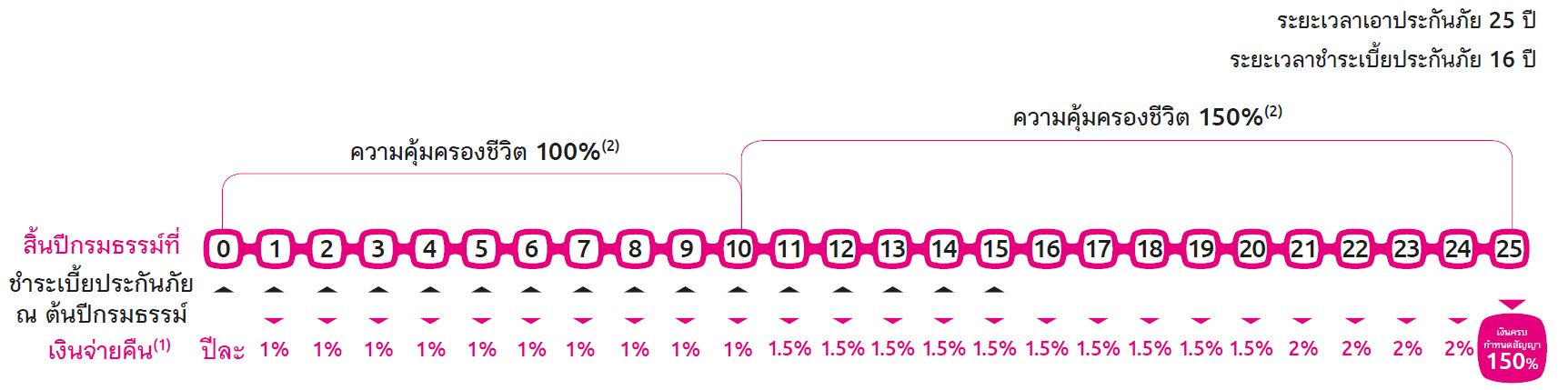 - รับเงินจ่ายคืนทุกปี รวม 33% และเงินครบกำหนดสัญญา สูงถึง 150%