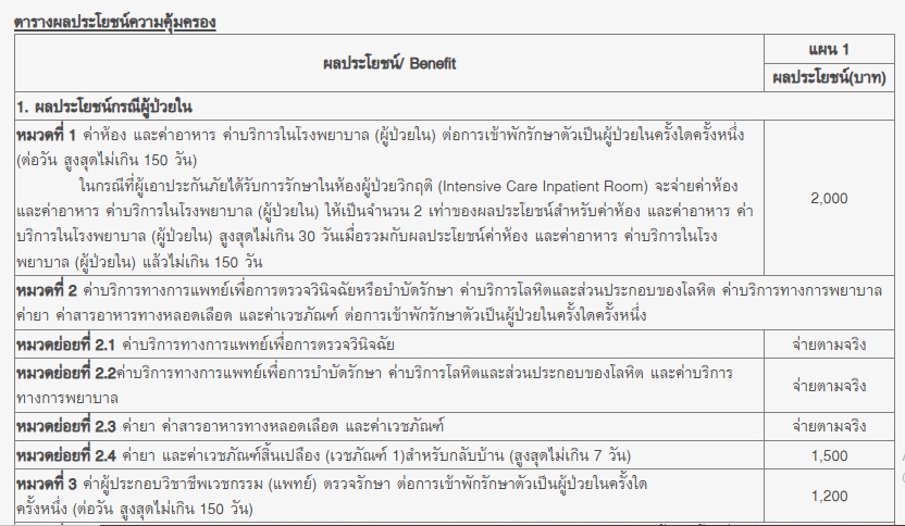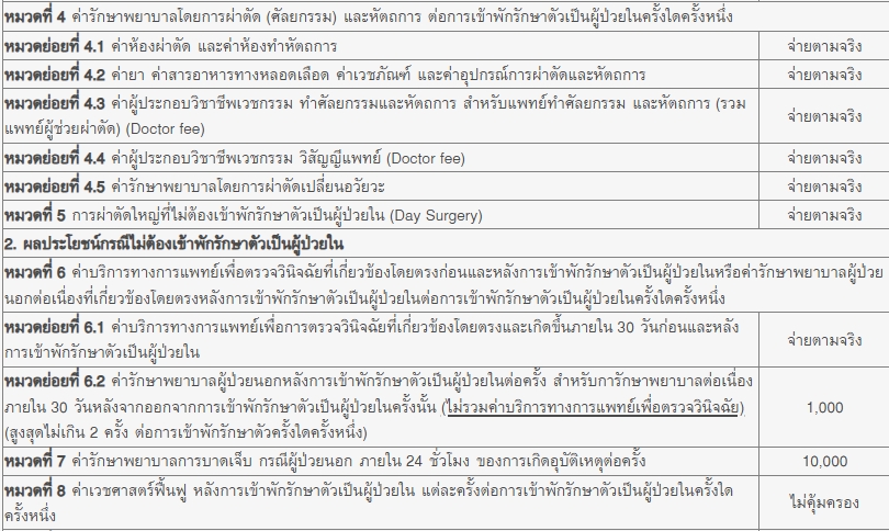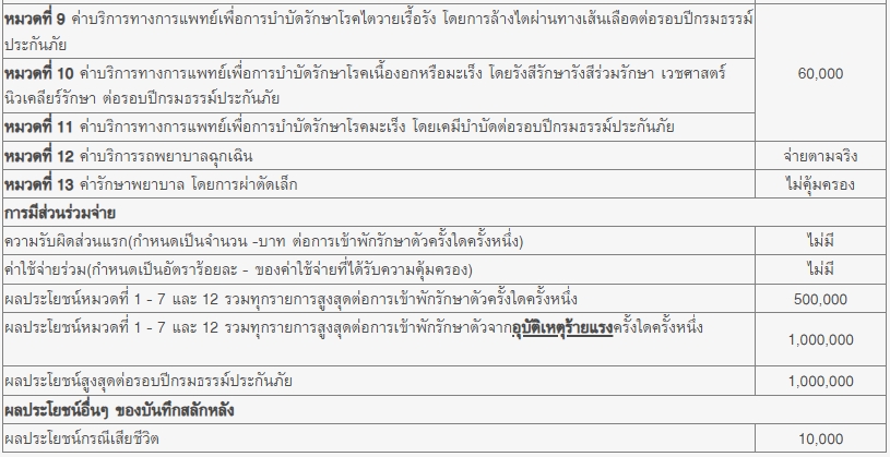 - ครอบคลุม ค่ารถพยาบาลฉุกเฉิน ค่าผ่าตัด ค่ารักษาพยาบาลอื่นๆ ในโรงพยาบาล เป็นต้น