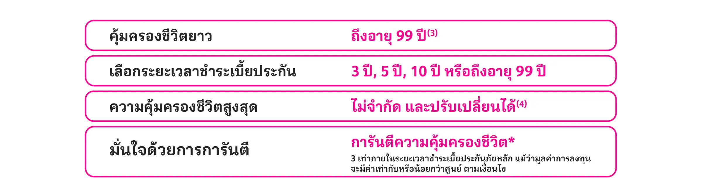 - การันตีความคุ้มครอง (Non-Lapse Guaranteed): มั่นใจได้ว่ากรมธรรม์จะมีผลบังคับอย่างต่อเนื่องในช่วงระยะเวลาชำระเบี้ยประกันภัยหลัก แม้มูลค่าการลงทุนจะเหลือศูนย์ (ภายใต้เงื่อนไขที่บริษัทกำหนด)