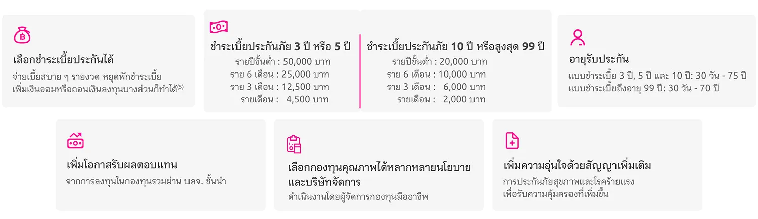 - โอกาสรับผลตอบแทนที่สูงกว่า: เงินค่าเบี้ยหลังหักค่าใช้จ่ายจะถูกนำไปลงทุนในกองทุนรวมชั้นนำ และสามารถสับเปลี่ยนกองทุนได้ฟรี ไม่จำกัดจำนวนครั้ง